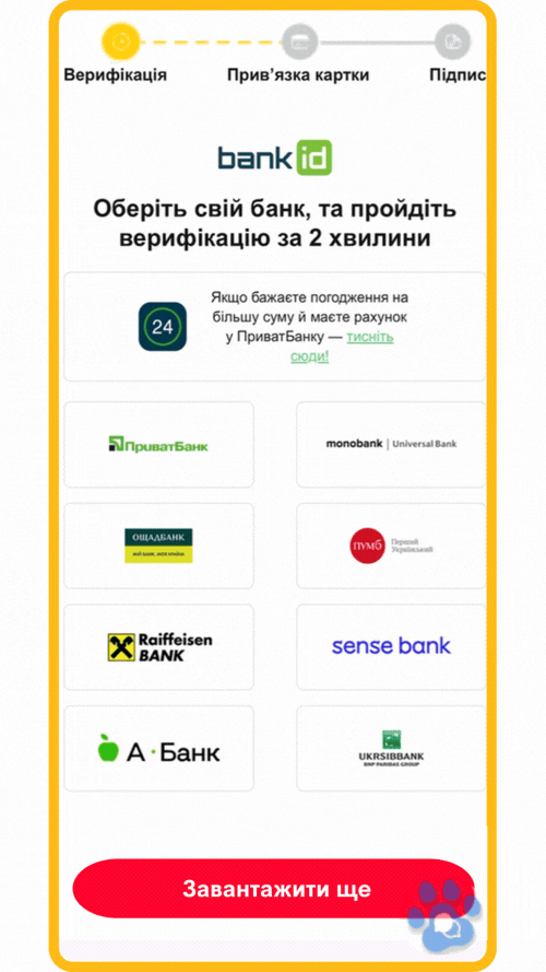 BankID НБУ (якщо ти є клієнтом іншого банку) та вибери свій банк зі списку. Якщо твого банку немає в списку, натисни "Завантажити ще", щоб побачити повний перелік. Для продовження натисни кнопку "Так".