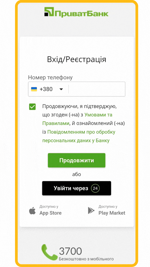 На сайті банку або у мобільному банкінгу введи свої дані (номер і пароль) для авторизації.