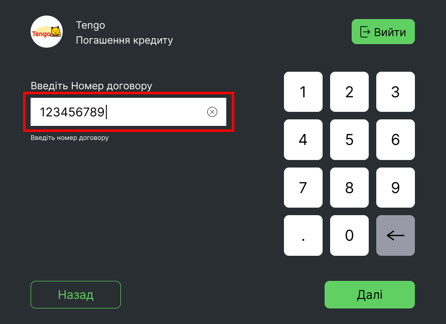 3 Введи номер договору (5–7 цифр) і натисни "Далі".