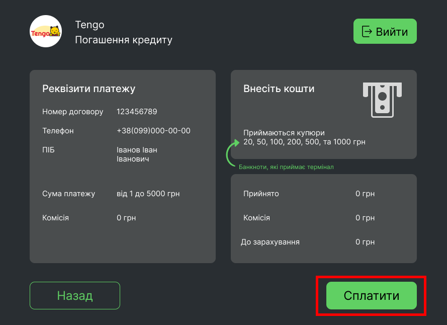 6 Внеси купюри до термінала. Мінімальна сума — 20 грн.